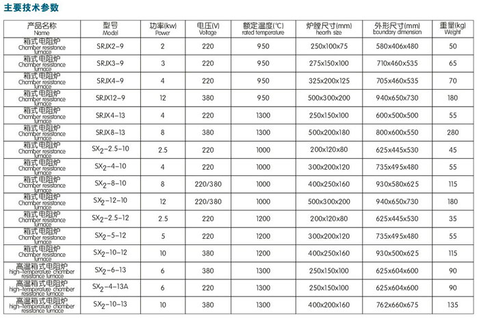 本系列電阻爐均系周期作業式,供實驗室、工礦企業、科研等單位作元素分析測定和一般小型鋼件淬火、退火、回火等熱處理時加熱用。另其額定溫度為1300℃的高溫箱式電阻爐,可以作為合金鋼的熱處理及金屬燒結、熔解、分析等高溫加熱用。